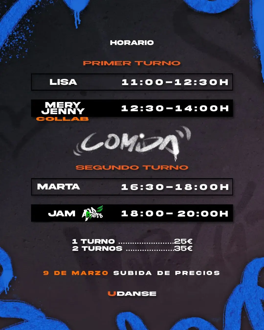 * clase suelta: 20€ * solo JAM: 10€